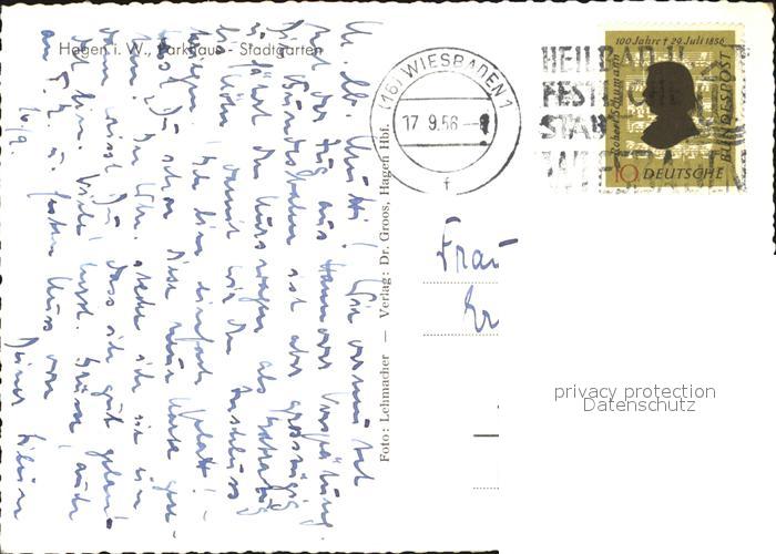 72582770 alte Postkarte Hagen Westfalen Stadtgarten postalisch gelaufen Erhaltung siehe scans [LiesaD40] KatCode: 11110005914000