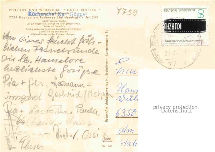74039789 alte Postkarte Hagnau Bodensee Ortsansicht mit Kirche Weinstube Guter Tropfen Gastraum postalisch gelaufen Erhaltung siehe scans [FriedD77] KatCode: 11110008435018