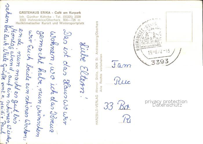 72455916 alte Postkarte Hahnenklee-Bockswiese Harz Gaestehaus Erika Cafe am Kurpark postalisch gelaufen Erhaltung siehe scans KatCode: 11110003153005
