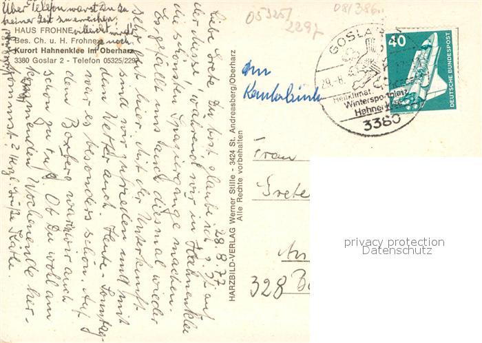 73651859 alte Postkarte Hahnenklee-Bockswiese Harz Gaestehaus Pension Haus Frohne Gastraum Garten postalisch gelaufen Erhaltung siehe scans [FriedD77] KatCode: 11110003153005