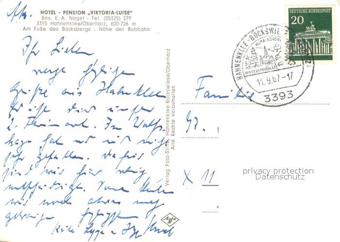 73708477 alte Postkarte Hahnenklee-Bockswiese Harz Hotel Pension Viktoria Luise Parkanlagen Teich Fontaene postalisch gelaufen Erhaltung siehe scans [FriedD77] KatCode: 11110003153005