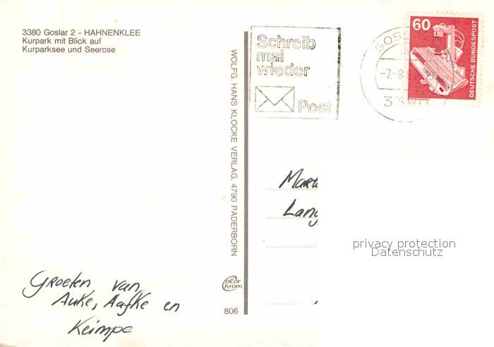 72862759 alte Postkarte Hahnenklee-Bockswiese Harz Kurpark mit Kurparksee und Seerose postalisch gelaufen Erhaltung siehe scans [WerneD78] KatCode: 11110003153005