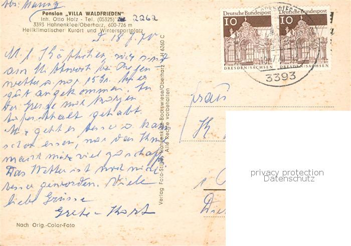 73862889 alte Postkarte Hahnenklee-Bockswiese Harz Pension Vila Waldfrieden postalisch gelaufen Erhaltung siehe scans [WerneD78] KatCode: 11110003153005