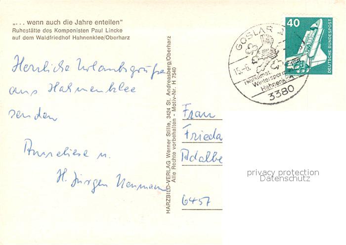 73241267 alte Postkarte Hahnenklee-Bockswiese Harz Waldfriedhof Ruhestaette Komponist Paul Lincke postalisch gelaufen Erhaltung siehe scans [KathaD81] KatCode: 11110003153005
