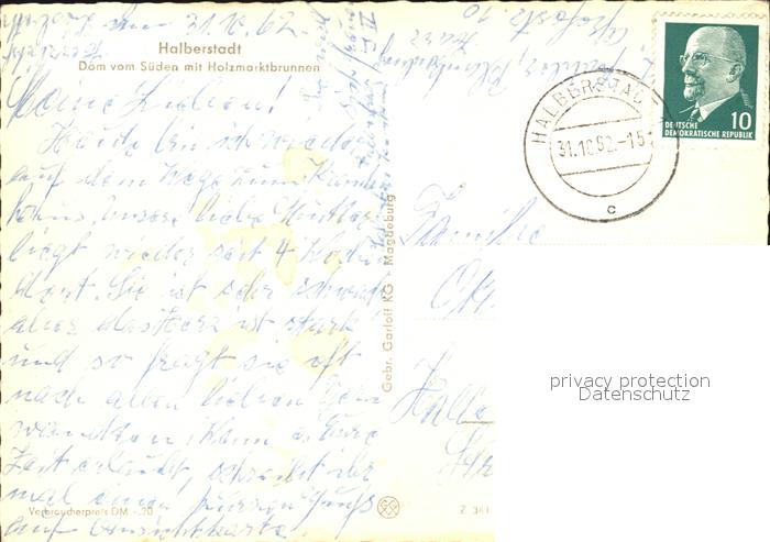 72506321 alte Postkarte Halberstadt Dom Holzmarktbrunnen postalisch gelaufen Erhaltung siehe scans KatCode: 11110015085135
