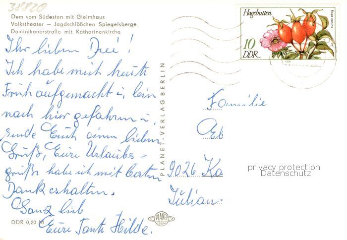 73753589 alte Postkarte Halberstadt Dom von Suedwesten mit Gleimhaus Volkstheater Jagdschloesschen Spiegelsberge Dominikanerstrasse mit Katharinenkirche postalisch gelaufen Erhaltung siehe scans [FriedD77] KatCode: 11110015085135