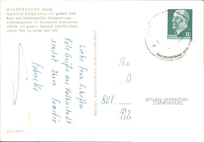 72365517 alte Postkarte Halberstadt Jagdschloss Spiegelberge mit grossem Fass Rats- u. Erholungsstaette Spiegelsberge postalisch gelaufen Erhaltung siehe scans KatCode: 11110015085135