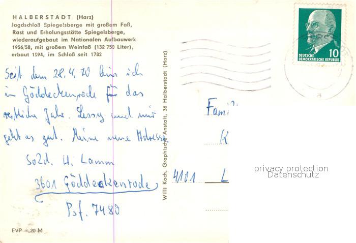 73727458 alte Postkarte Halberstadt Jagdschloss Spiegelsberge mit grossem Fass Rast- und Erholungsstaette postalisch gelaufen Erhaltung siehe scans [FriedD77] KatCode: 11110015085135