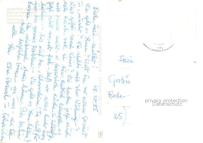 73767200 alte Postkarte Halberstadt Jagdschloss Spiegelsberge Panorama Fass Freiterrasse Gaststaette postalisch gelaufen Erhaltung siehe scans [FriedD77] KatCode: 11110015085135