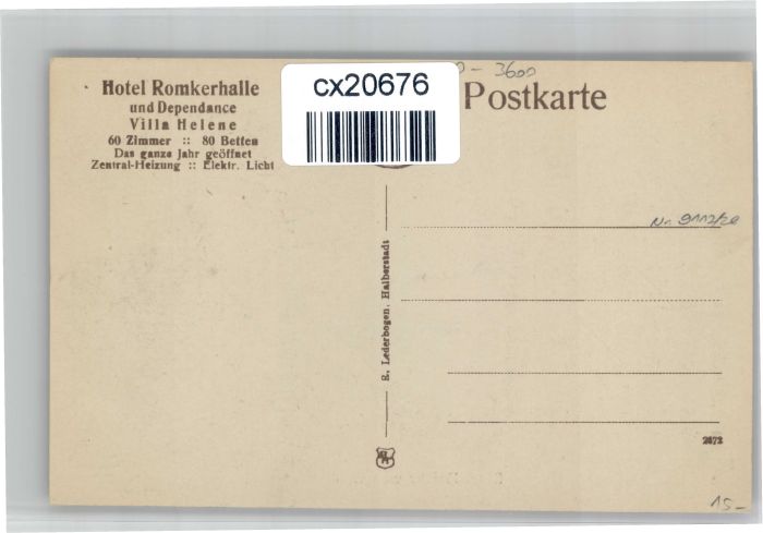 30740274 Halberstadt [Verlag R. Lederbogen] Hotel Romkerhalle postalisch nicht gelaufen KatCode: 11110015085135