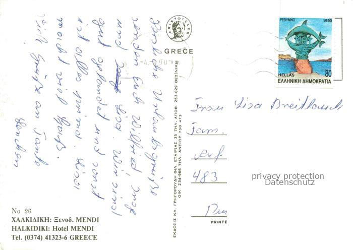 74095602 old postcard Halkidiki Chalkidiki Greece Hotel Mendi Panorama Pool postalisch gelaufen Erhaltung siehe scans [WerneD78] KatCode: 11190