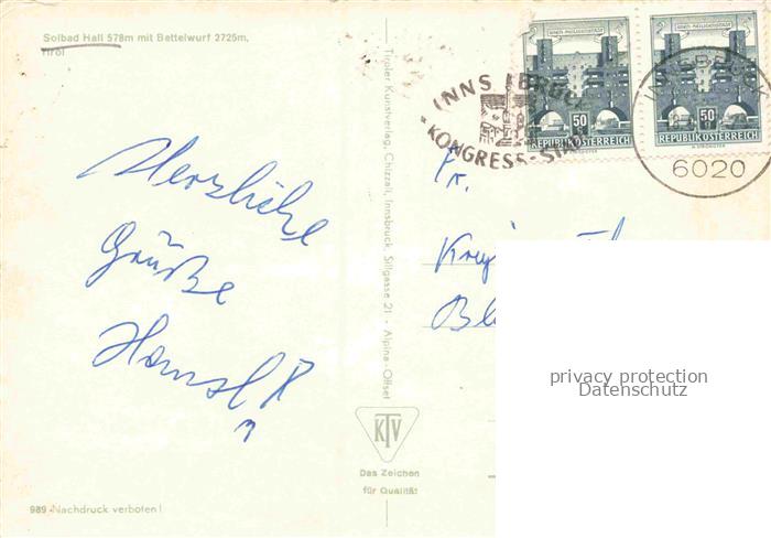 74157577 alte Postkarte Hall Tirol AT Bettelwurf Winterlandschaft Schnee Fluss Solbad Kirchturm Altstadt Bergpanorama postalisch gelaufen Erhaltung siehe scans [Karloger] KatCode: 11390332070354