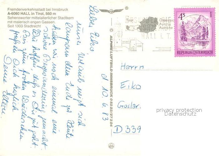 73049182 alte Postkarte Hall Tirol Fliegeraufnahme Muenzturm aelteste Talerpraegestaette der Welt postalisch gelaufen Erhaltung siehe scans [KathaD81] KatCode: 11390332070354