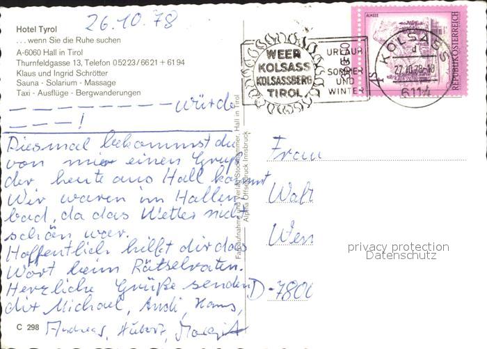72229312 alte Postkarte Hall Tirol Hotel Tyrol postalisch gelaufen Erhaltung siehe scans KatCode: 11390332070354