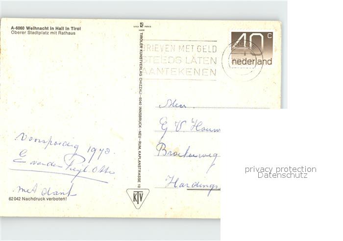 72108562 alte Postkarte Hall Tirol Obere Stadtplatz Rathaus Weihnachtsbaum postalisch gelaufen Erhaltung siehe scans KatCode: 11390332070354