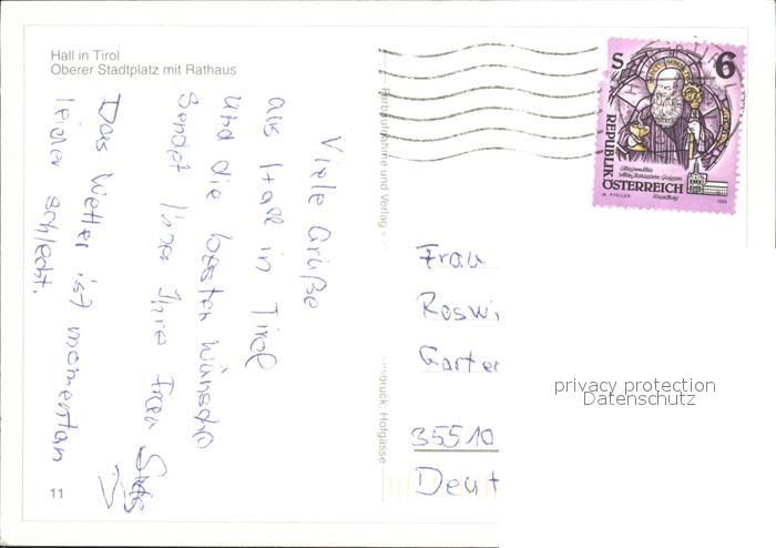 12384702 alte Postkarte Hall Tirol Oberer Stadtplatz mit Rathaus postalisch gelaufen Erhaltung siehe scans KatCode: 11390332070354