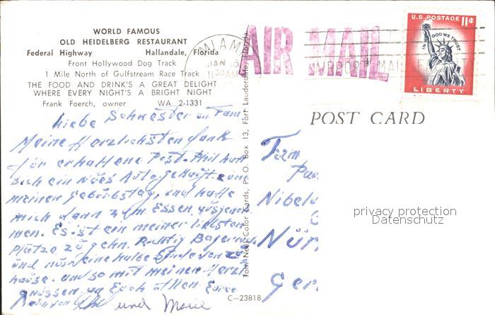 72272286 old postcard Hallandale Old Heidelberg Restaurant postalisch gelaufen Erhaltung siehe scans KatCode: 14140110000000