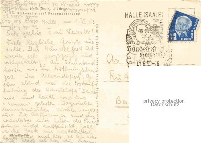 74035944 alte Postkarte HALLE SAALE 5 Tuerme Silhouette nach Sonnenuntergang postalisch gelaufen Erhaltung siehe scans [FriedD77] KatCode: 11110015002000