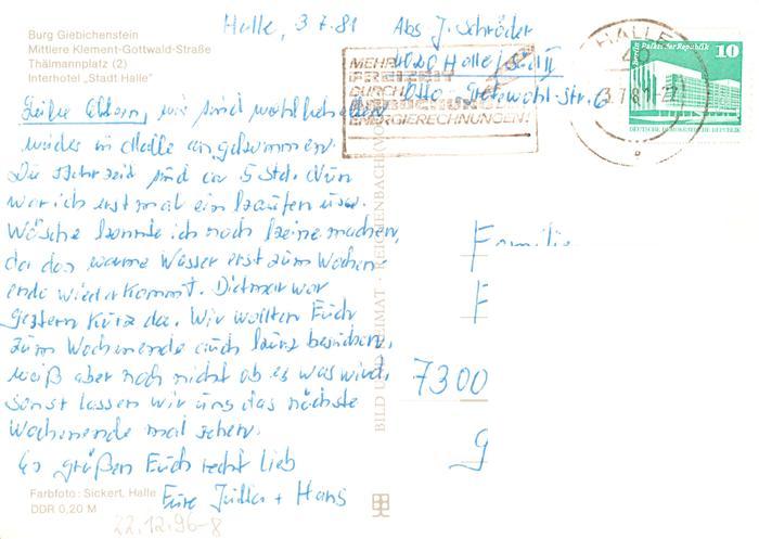 73900828 Halle Saale Burg Giebichenstein Mittlere Klement Gottwald Strasse Thaelmannplatz Interhotel Stadt Halle postalisch gelaufen Erhaltung siehe scans [FriedD77] alte Postkarte Frie Katcode 11110015002000