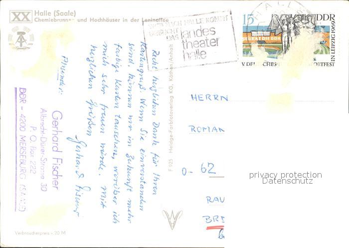 72542922 alte Postkarte Halle Saale Chemiebrunnen und Hochhaeuser in der Leninallee postalisch gelaufen Erhaltung siehe scans [AndreD76 kv012box] KatCode: 11110015002000