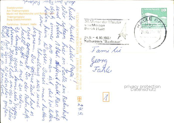 72259595 alte Postkarte Halle Saale Eselsbrunnen Thalmannplatz Burg Giebichenstein postalisch gelaufen Erhaltung siehe scans KatCode: 11110015002000