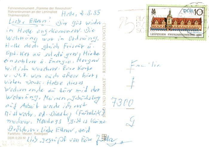 73924117 Halle Saale Fahnenmonument Flamme der Revolution Roehrenbrunnen an der Leninallee Thaelmannplatz postalisch gelaufen Erhaltung siehe scans [FriedD77] alte Postkarte Frie Katcode 11110015002000