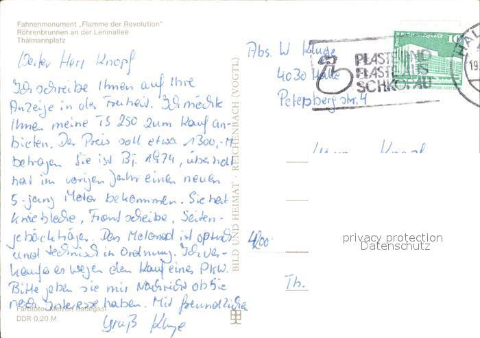 72116511 alte Postkarte Halle Saale Fahnenmonument Roehrenbrunnen Thaelmannplatz postalisch gelaufen Erhaltung siehe scans KatCode: 11110015002000