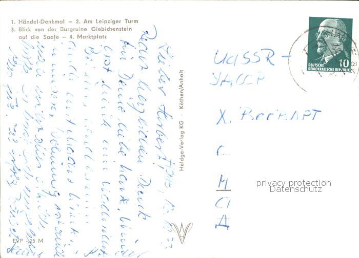 72357851 alte Postkarte Halle Saale Haendel Denkmal Leipziger Turm Burgruine Giebichenstein Marktplatz postalisch gelaufen Erhaltung siehe scans KatCode: 11110015002000