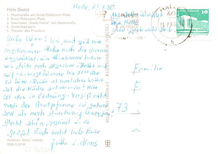 73900825 alte Postkarte Halle Saale Hochstrasse Ernst Thaelmann Platz Interhotel Stadt Halle mit Hochstrasse Giebichenstein Theater des Friedens postalisch gelaufen Erhaltung siehe scans [FriedD77] KatCode: 11110015002000