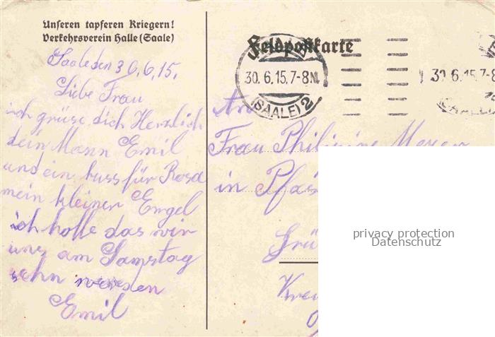 74009033 alte Postkarte Halle Saale Marktplatz Kuenstlerkarte Unseren tapferen Kriegern Verkehrsverein Halle postalisch gelaufen Feldpost – Stempel Erhaltung siehe scans [FriedD77] KatCode: 11110015002000