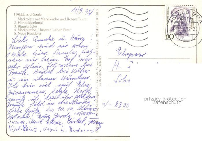 73239558 alte Postkarte Halle Saale Marktplatz Marktkirche Roter Turm Haendeldenkmal Klausbruecke Chronik postalisch gelaufen Erhaltung siehe scans [KathaD81] KatCode: 11110015002000