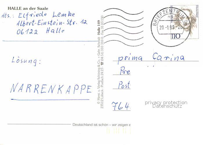 72746005 alte Postkarte Halle Saale Rathaus Moritzburg Kirche Haendel Denkmal Burg Giebichenstein Roland Statue Marktplatz Leipziger Strasse Turm postalisch gelaufen Erhaltung siehe scans [FriedD77] KatCode: 11110015002000