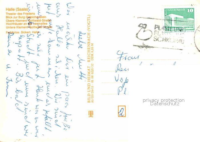 72697449 alte Postkarte Halle Saale Theater Burg Giebichenstein Klement Gottwald Str Hochhaeuser Leninallee postalisch gelaufen Erhaltung siehe scans [WerneD78] KatCode: 11110015002000