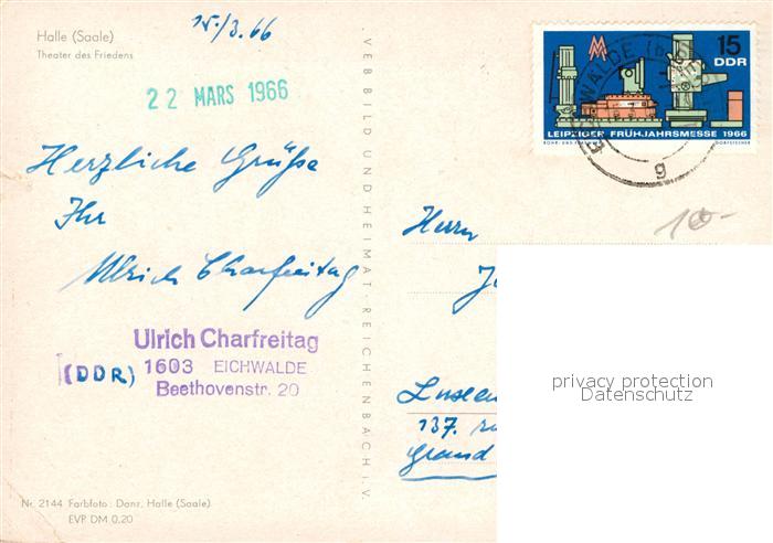 72998289 alte Postkarte Halle Saale Theater des Friedens postalisch gelaufen Erhaltung siehe scans [WerneD78] KatCode: 11110015002000