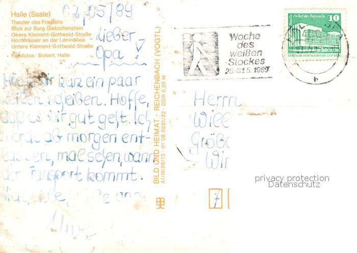 72953667 alte Postkarte Halle Saale Theater des Friedens Burg Giebichenstein Klement Gottwald Str Hochhaeuser Leninallee postalisch gelaufen Erhaltung siehe scans [WerneD78] KatCode: 11110015002000