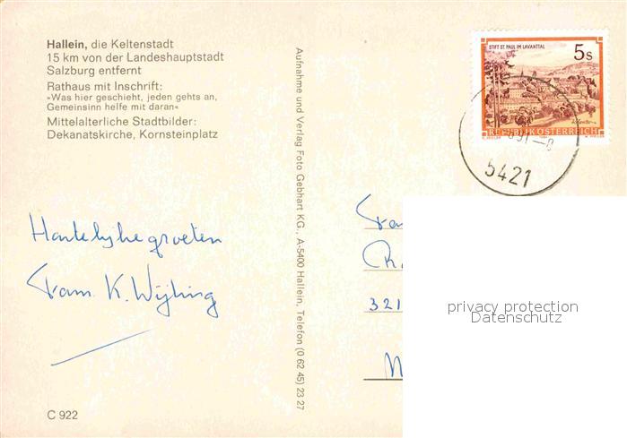 72887414 alte Postkarte Hallein Rathaus Dekanatskirche Kornsteinplatz postalisch gelaufen Erhaltung siehe scans [WerneD78] KatCode: 11390323050205