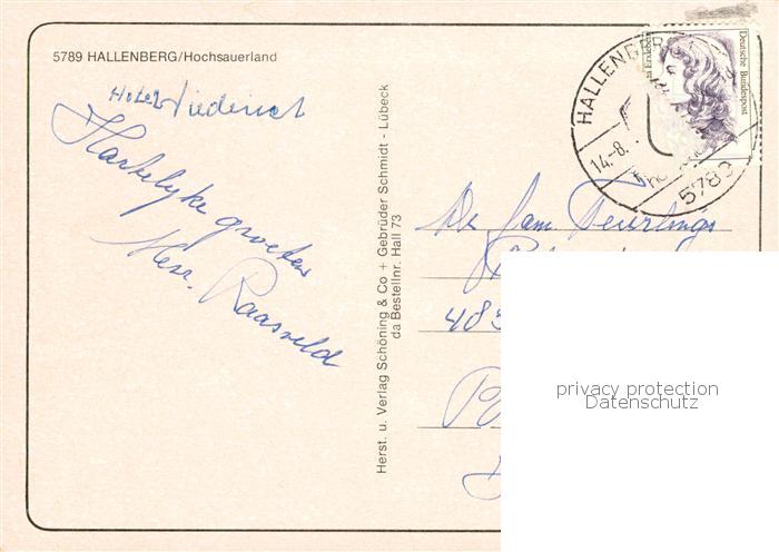 73814084 alte Postkarte Hallenberg Aussichtsturm Kreuzberg Hauptstrasse Brunnen Freilichtbuehne Kapelle Kirchplatz Unterkirche postalisch gelaufen Erhaltung siehe scans [FriedD77] KatCode: 11110005958020
