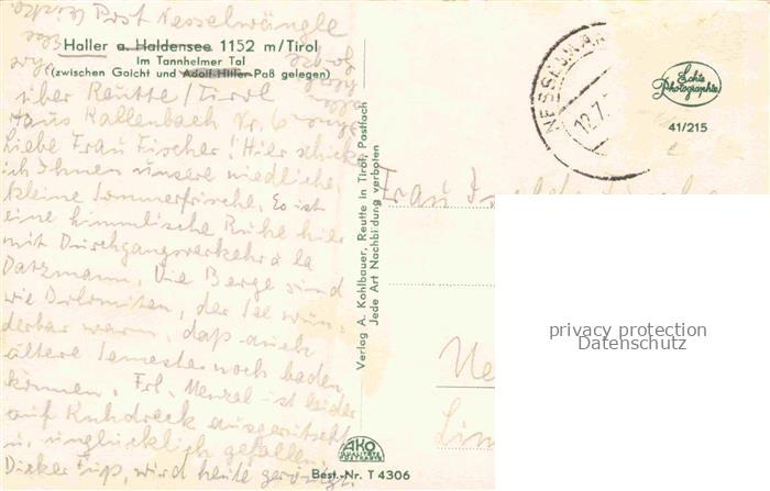 74130746 alte Postkarte Haller Haldensee Tirol AT Im Tannhelmer Tal postalisch gelaufen Erhaltung siehe scans [IrynaD87] KatCode: 11390331070811