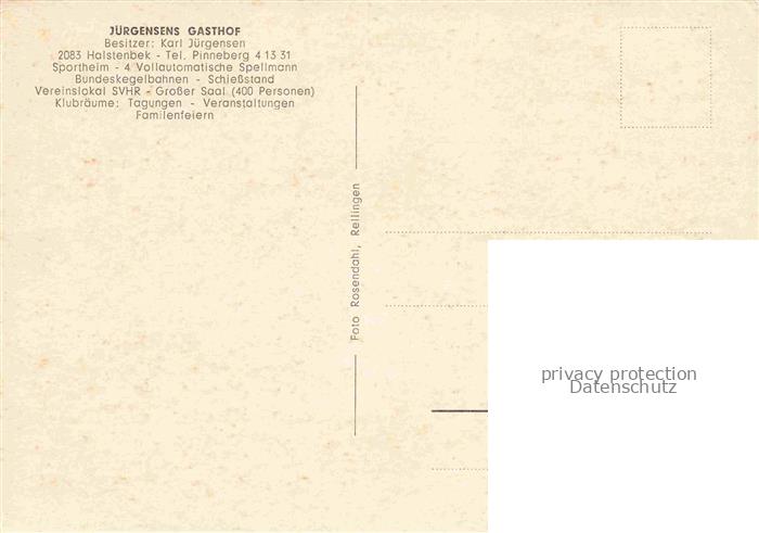74034623 Halstenbek Holstein Juergensens Gasthof Gastraeume Kegelbahn postalisch nicht gelaufen Erhaltung siehe scans [WerneD78] KatCode: 11110001056018