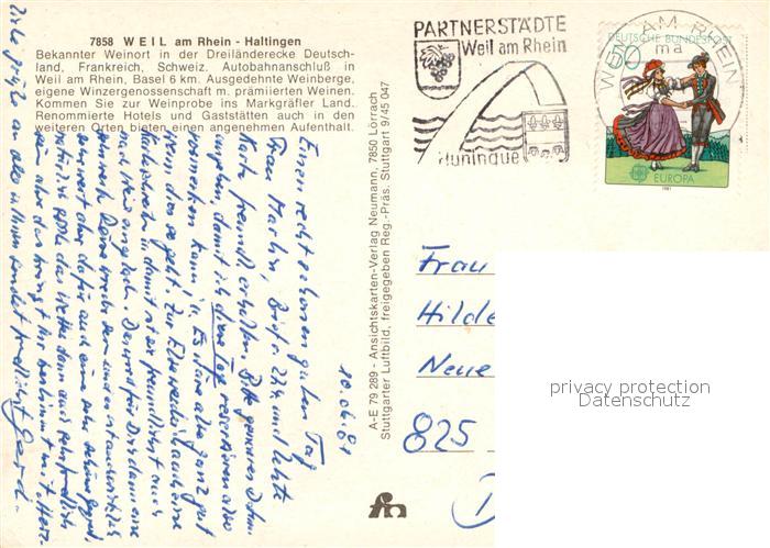 73647465 Haltingen Weil am Rhein BW Weinort im Dreilaendereck Deutschland Frankreich Schweiz Schwarzwald Fliegeraufnahme postalisch gelaufen Erhaltung siehe scans [FriedD77] alte Postkarte Frie Katcode 11110008336091