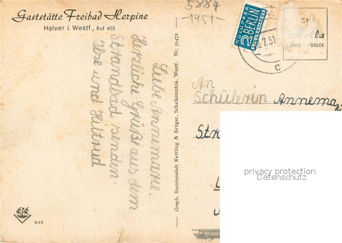 73710050 alte Postkarte Halver Strandbad Herpine postalisch gelaufen Erhaltung siehe scans [LiesaD40] KatCode: 11110005962012