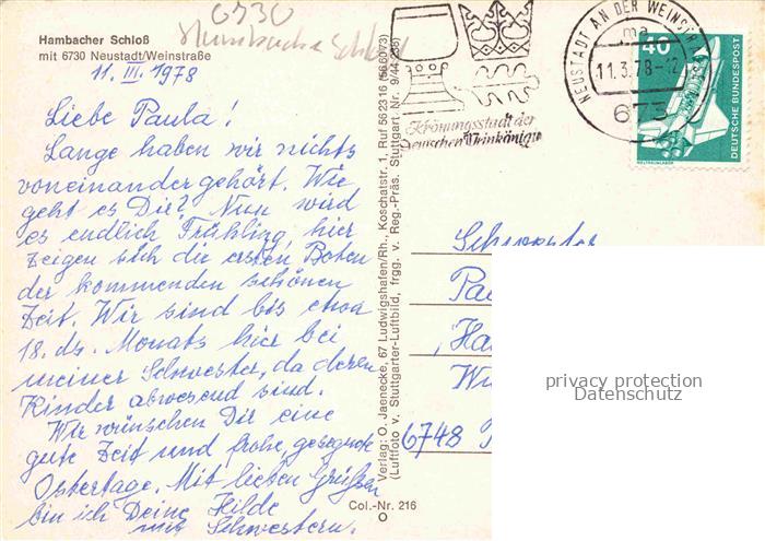74042340 alte Postkarte Hambach Neustadt Weinstrasse Hambacher Schloss postalisch gelaufen Fliegeraufnahme Erhaltung siehe scans [WerneD78] KatCode: 11110007316000