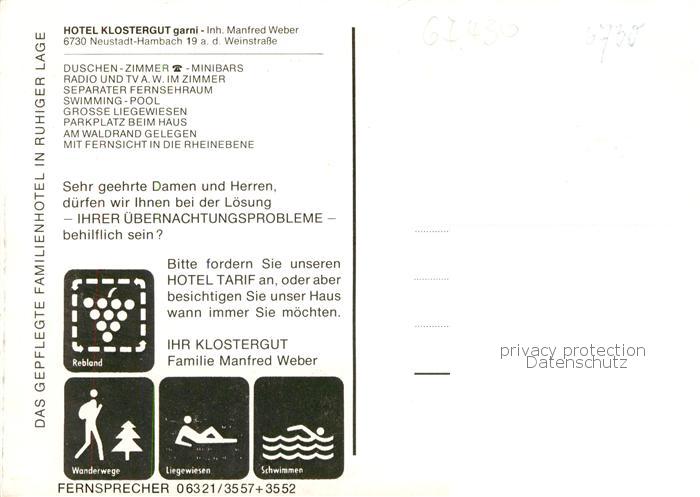 73871475 Hambach Neustadt Weinstrasse Hotel Klostergut garni Zeichnung postalisch nicht gelaufen Erhaltung siehe scans [WerneD78] Wern Katcode 11110007316000