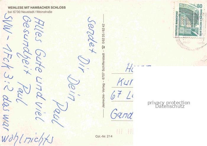 74006923 alte Postkarte Hambach Neustadt Weinstrasse Weinlese mit Hambacher Schloss postalisch gelaufen Erhaltung siehe scans [WerneD78] KatCode: 11110007316000