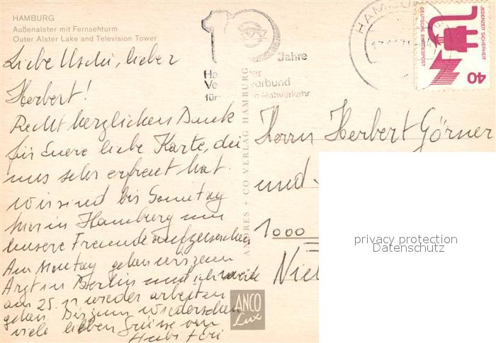 72974879 alte Postkarte Hamburg aussenalster mit Fernsehturm postalisch gelaufen Erhaltung siehe scans [LiesaD40] KatCode: 11110002000000