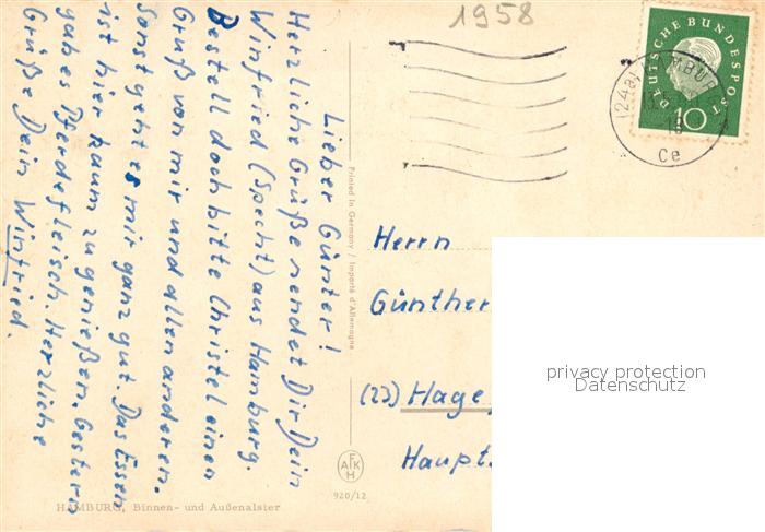 73063770 alte Postkarte Hamburg Binnen und Aussenalster Fliegeraufnahme postalisch gelaufen Erhaltung siehe scans [FriedD77] KatCode: 11110002000000