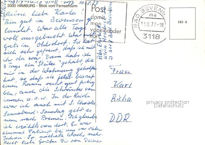 alte Postkarte Hamburg Blick vom Fernsehturm postalisch gelaufen Erhaltung siehe scans