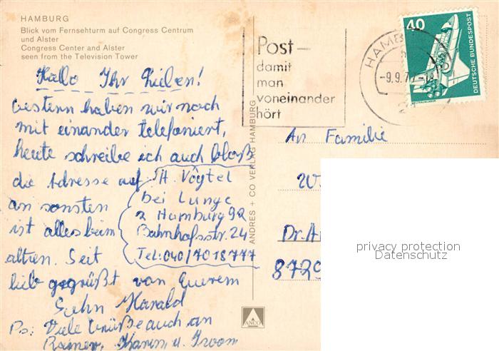 73256537 alte Postkarte Hamburg Blick vom Fernsehturm auf Congress Centrum und Alster postalisch gelaufen Erhaltung siehe scans [FriedD77] KatCode: 11110002000000