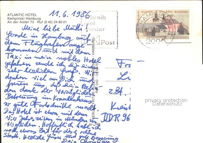71952446 alte Postkarte HAMBURG CITY Atlantic Hotel Alster postalisch gelaufen Erhaltung siehe scans KatCode: 11110002000000