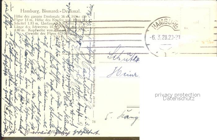 72150354 alte Postkarte HAMBURG CITY Bismarckdenkmal postalisch gelaufen Erhaltung siehe scans KatCode: 11110002000000